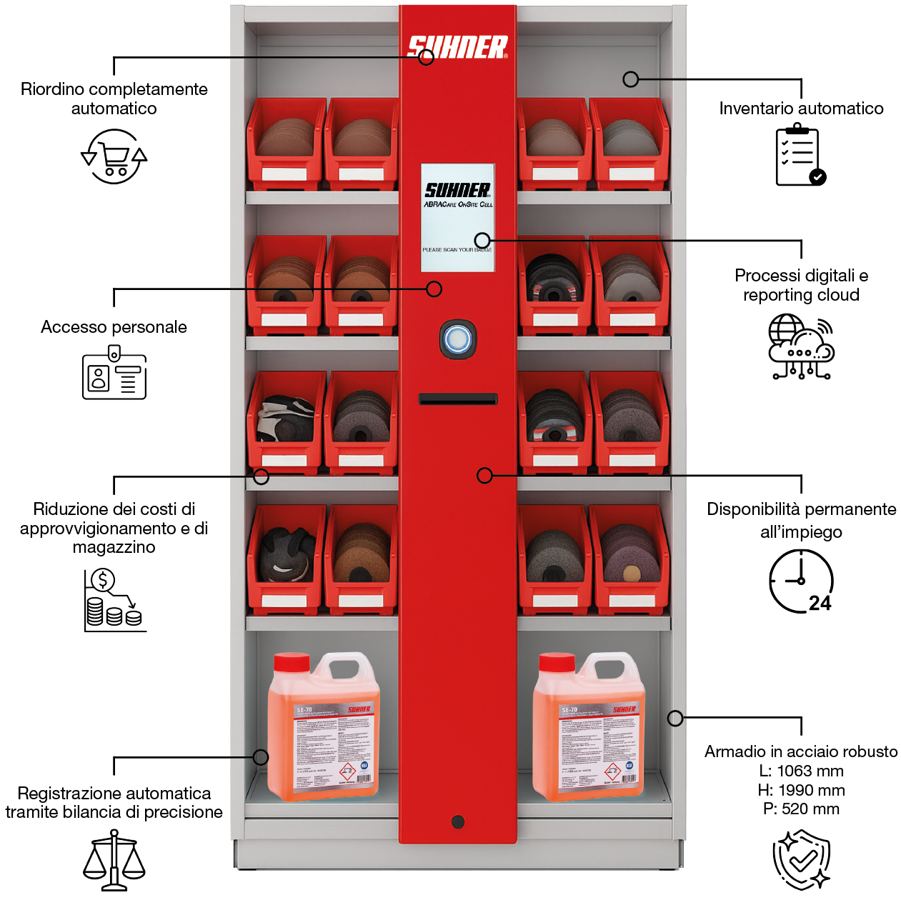 Chi lavora nella lavorazione dei metalli conosce bene il problema: gli abrasivi mancano proprio quando servono oppure restano inutilizzati per mesi nell’armadio. Con l’ABRAcare OnSite Cell di SUHNER porti ordine completo nella tua produzione. Il sistema di ordinazione automatizzato garantisce il rifornimento prima che qualcosa venga a mancare. Con il servizio a 360° per il tuo parco utensili, l’approvvigionamento funziona in background, in modo affidabile e chiaro. Questo riduce il lavoro di ordinazione ed evita i tempi di fermo, portando al tempo stesso struttura, trasparenza e velocità nei tuoi processi.